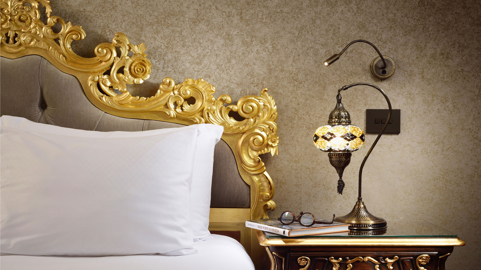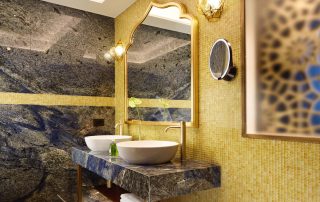 L’appartamento dedicato a Theodora è prezioso e raffinato, decorato con dettagli di lusso dove l’oro si combina a colori brillanti in una vivace palette di blu, verde, beige e bruno.